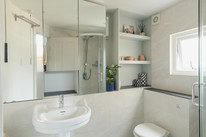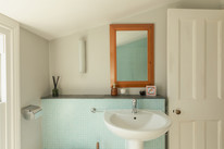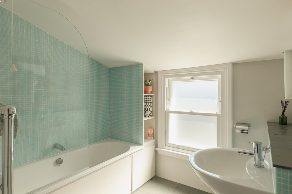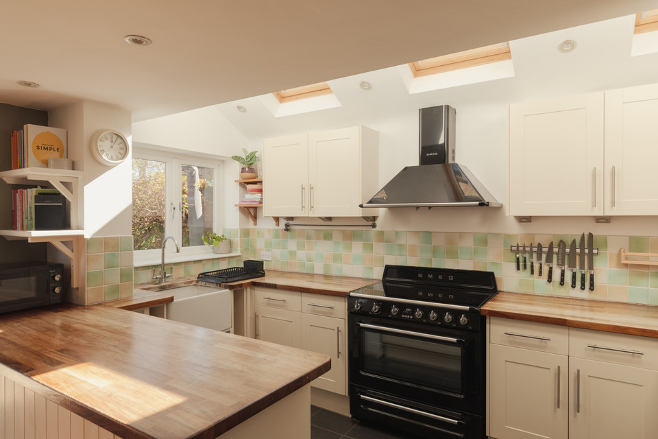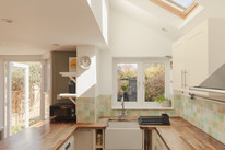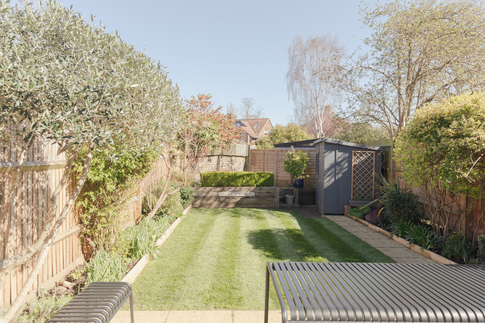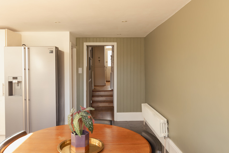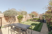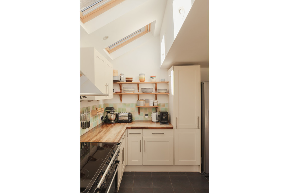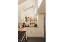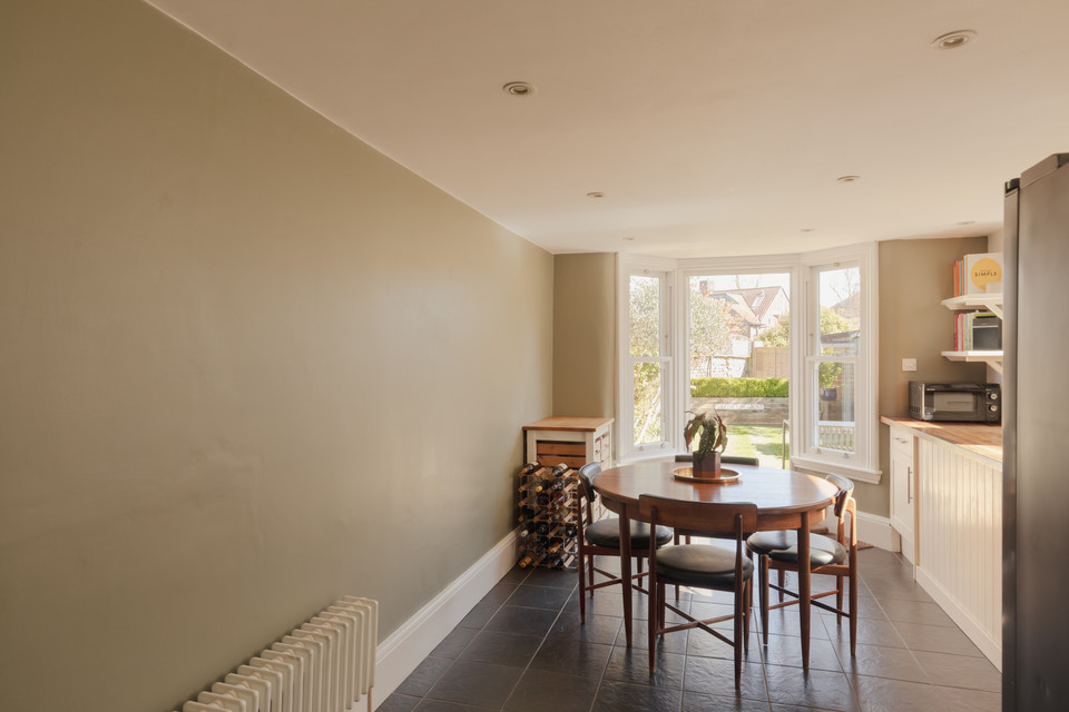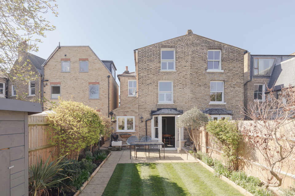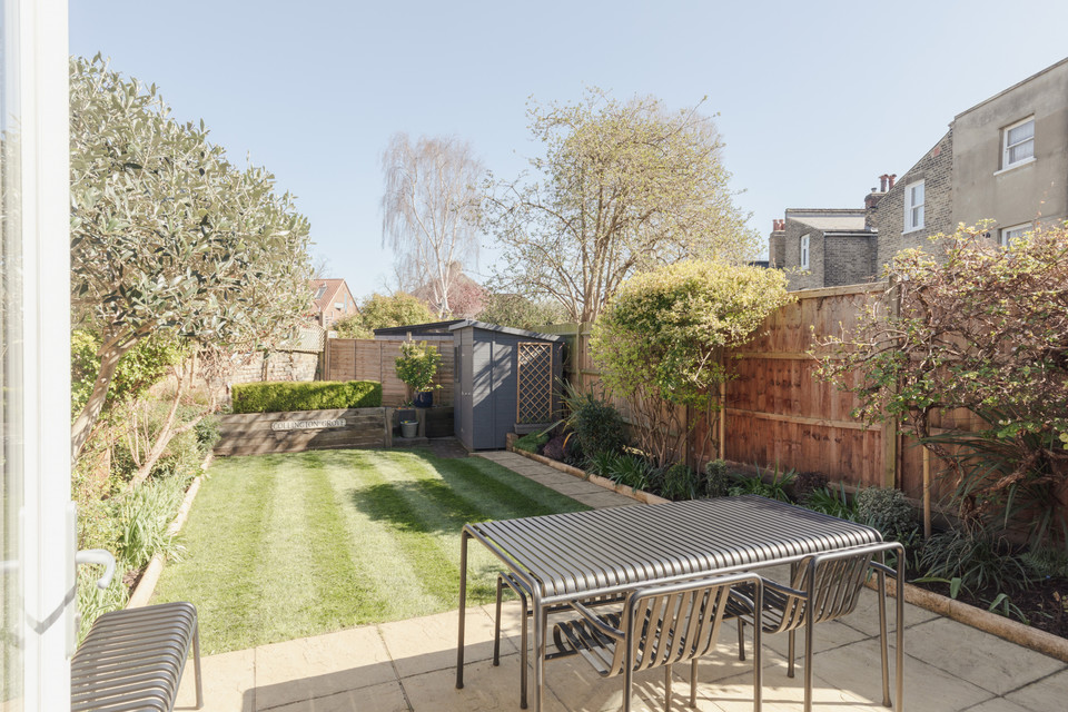 A cool ‘pocket’ door reveals your kitchen/diner of 18 feet by 16 feet. The fitted kitchen units are topped with wooden counters and a big ceramic Butler sink rests under the window. Velux windows run over the former side-return area, and there is underfloor heating. Another bay hosts your back door out onto the paved area of the garden. Borders are well-stocked and provide year-round interest. A healthy lawn further impresses.