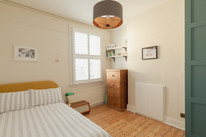 Next door is a roomy double bedroom of over 11 feet by over 10 feet, with a big built-in wardrobe to the near alcove, and stripped boards to the floor.