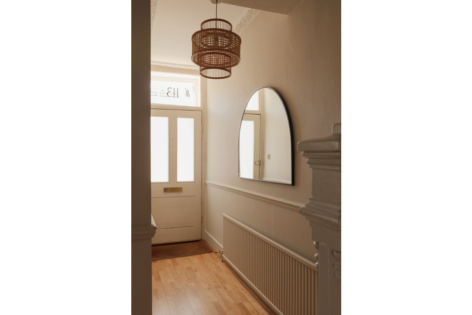 A smart walled front garden with traditional tiled path is an inviting welcome. From the neat high-ceilinged hall, you have the double-reception to your right. This runs over 25 feet by over 12 feet. Wooden floors, sash windows (custom-made shutters to the lower panes) and an attractive working fireplace feature here.
