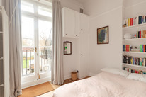 Your second bedroom is next door. A cosier double this time (of 10 feet by 8 feet) with built-in shelves and cupboards, and the flat’s second set of French doors onto your balcony, and more verdant views!