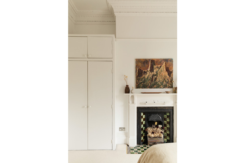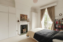 Next door is the property’s principal bedroom (of 14 feet by 12 feet), with another tasteful fireplace. Two sizeable built-in wardrobes feature to both alcoves, and you have pale carpet to the floor plus more box-ticking picture rail and coving. Timber-framed glazed French doors open to your private balcony and leafy west-facing vista.